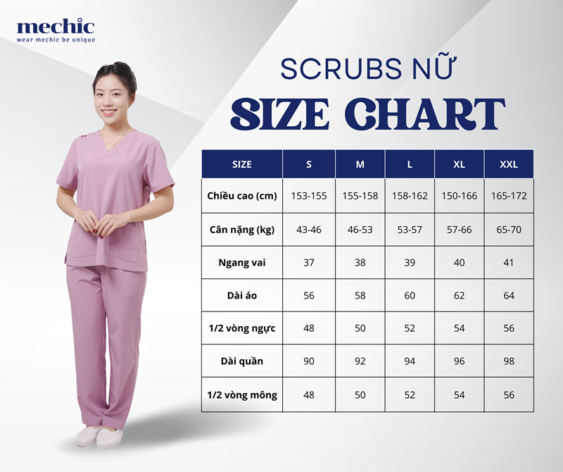 Bạn nên chọn size dựa trên chiều cao và cân nặng. Nếu thích mặc thoải mái hoặc mặc bên ngoài scrubs, có thể tăng thêm 1 size để dễ vận động trong quá trình làm việc.