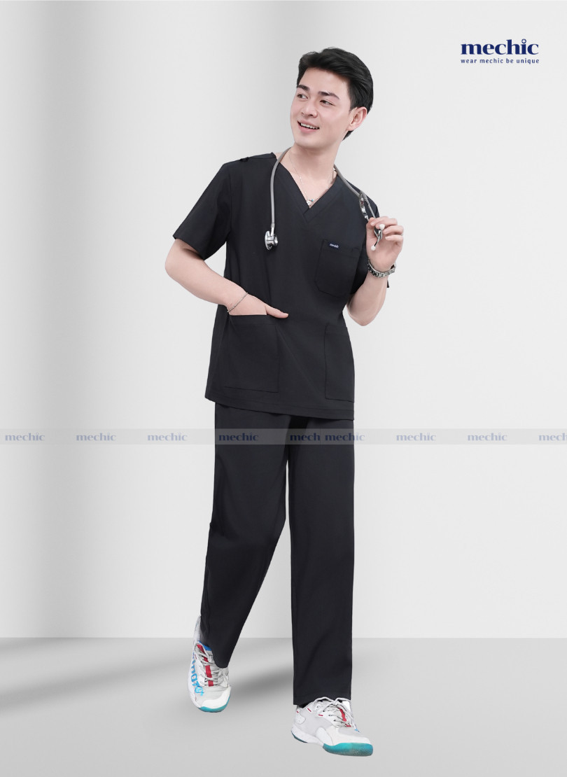 Bộ Scrubs cổ tim nam - đen 01 của MECHIC thiết kế chuyên nghiệp với cổ tim (chữ V) hiện đại, form vừa vặn cân bằng giữa sự thoải mái và tính chuyên nghiệp cho nhân viên y tế nam.