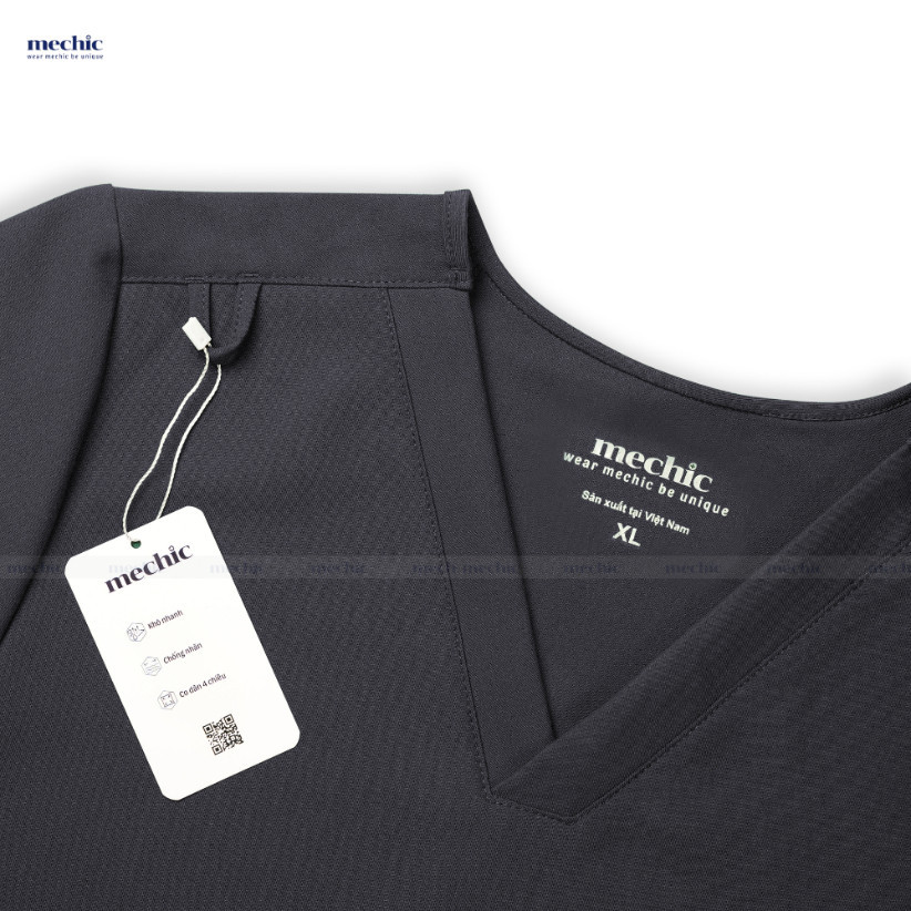 MECHIC chọn công nghệ vải Nano poly spandex co giãn 4 chiều cho bộ Scrubs nam đen 01, tối ưu cho môi trường y tế khắt khe.