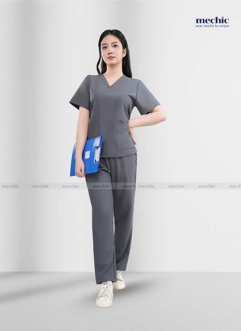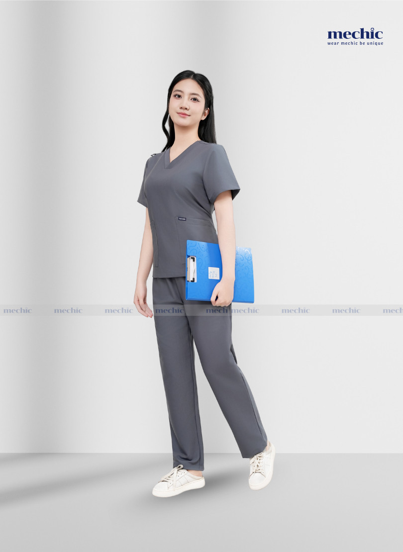 Lựa chọn scrubs cổ tim nữ màu ghi Mechic – Đồng hành cùng phong cách y tế hiện đại